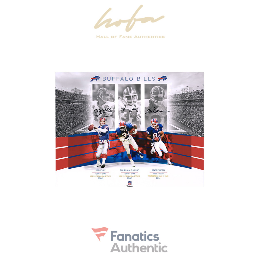 Commemorate the legendary careers of three of the best Buffalo Bills players ever with this autographed Jim Kelly, Thurman Thomas, and Andre Reed Collage photograph. Whether displayed in your home or office, it’s the perfect way to highlight your passion for the Buffalo Bills for years to come.