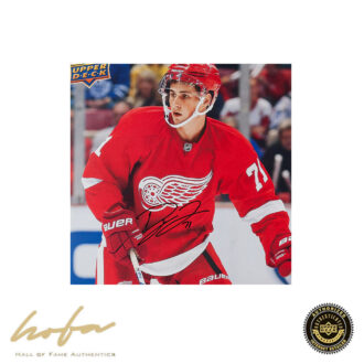 Upper Deck’s Young Guns series of trading cards debuted in 1990-91 Upper Deck Hockey. Since then, the series has undergone changes while steadily rising in popularity among trading card collectors. Now, it maintains a reputation as one of the hobby’s best rookie cards. To honor this popular and evolving card set, Upper Deck Authenticated has produced an oversized print matching the dimensions to scale for Detroit Red Wings center Dylan Larkin’s card while including a hard-signed autograph. This piece is five times the size of a regular trading card, measuring 12.5” x 17.5” and mimicking the exact image and design in Larkin’s Young Guns trading card. This blowup has the look of the original trading card with the added feature of the signature of one of the NHL’s hottest young skaters. It is printed on one side only for ideal framing. Larkin has signed this Young Guns 12.5” x 17.5” card in black paint pen. His signature is deemed authentic by virtue of Upper Deck Authenticated’s Five Step Process.