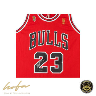 While the Chicago Bulls won their fifth NBA Finals championship with a victory on their home court in Game 6 of the series, it was the incredible effort of one Michael Jordan on the road in Game 5 that continues to be one of the greatest stories in the history of sport. With the series tied 2-2 after the Utah Jazz posted two impressive home wins, Game 5 in the Delta Center in Salt Lake City promised to be the turning point in the series for whichever team came out ahead. The night before the game, Jordan was diagnosed with either food poisoning or a stomach virus and was told not to play in the game. He suited up anyway and played despite being noticeably ill throughout. Jordan made a late 3-pointer to fuel an amazing comeback and individual performance, scoring 38 points before collapsing into Scottie Pippen’s arms in the closing seconds of a 90-88 win that came to be known as “The Flu Game.” Two days later the Bulls would go on to win their fifth title. This jersey commemorates the amazing road victory for the Bulls in that Game 5. Jordan has autographed this 1996-97 Bulls red away Mitchell & Ness jersey with a Finals trophy patch in silver paint pen. His signature is deemed authentic by virtue of Upper Deck Authenticated’s Five-Step Process.