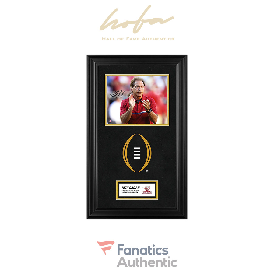 This deluxe framed 8″ x 10″ photograph has been personally hand-signed by Nick Saban. This photograph comes double matted with a suede top matte and framed in a wood frame. The product is officially licensed by the NCAA and comes with an individually numbered, tamper-evident hologram from Fanatics Authentic. To ensure authenticity, the hologram can be reviewed online. This process helps to ensure that the product purchased is authentic and eliminates any possibility of duplication or fraud. Overall dimensions are 16″ x 26″ x 1″.