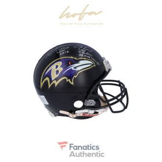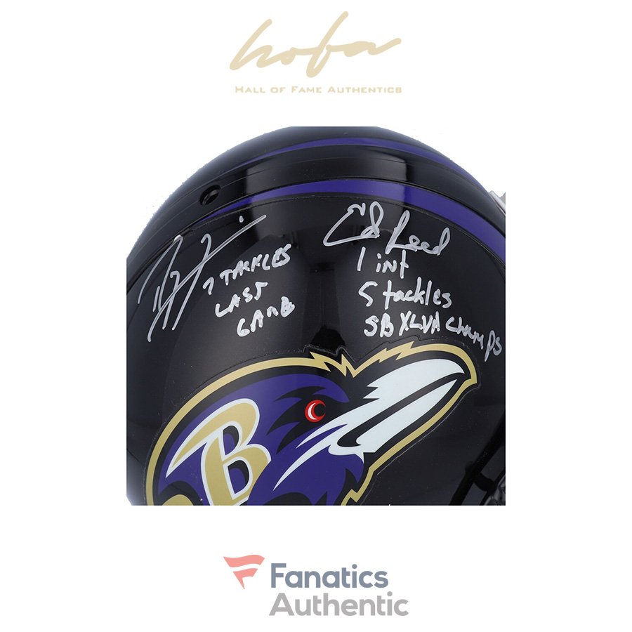 This helmet has been personally hand-signed by Ray Lewis and Ed Reed with the inscriptions “7 TACKLES, LAST GAME, 1 INT, 5 TACKLES, SB XLVII CHAMPS .” It is officially licensed by the National Football League and comes with an individually numbered, tamper-evident hologram from Fanatics Authentic. To ensure authenticity, the hologram can be reviewed online. This process helps to ensure that the product purchased is authentic and eliminates any possibility of duplication or fraud. This is a limited edition of 20.
