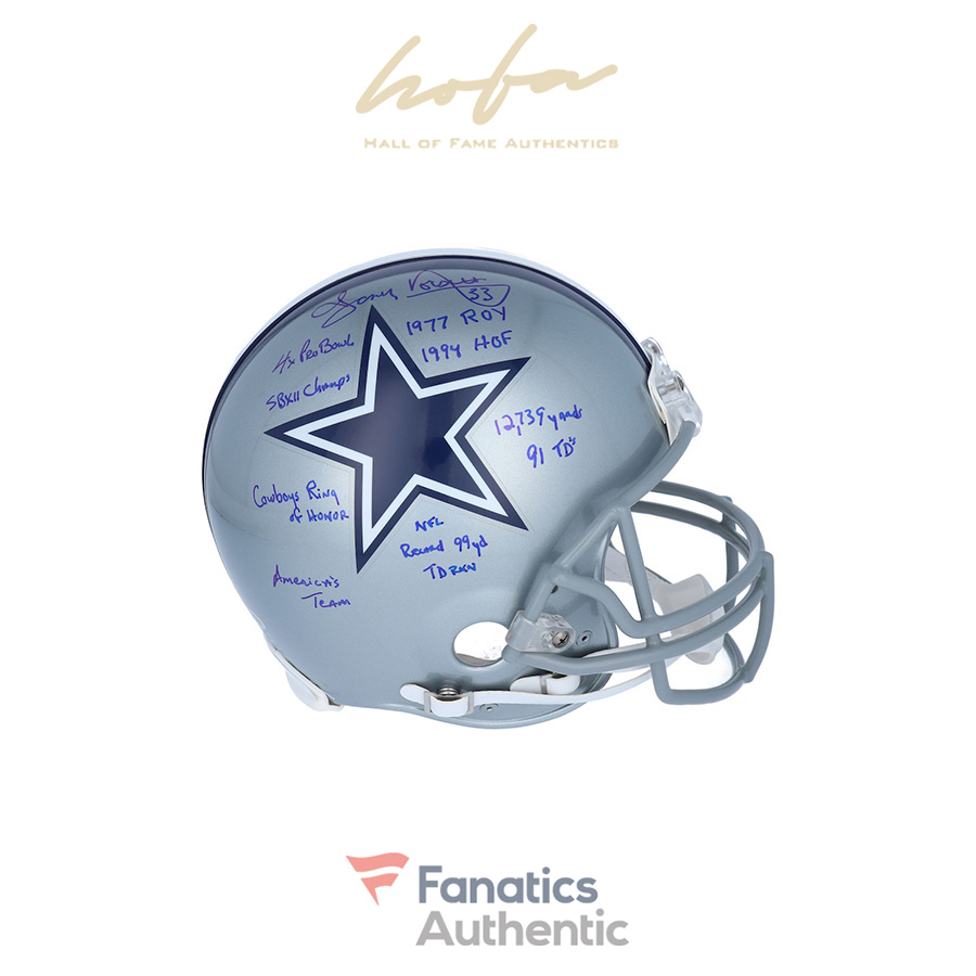 This helmet has been personally hand-signed by Tony Dorsett with the inscriptions “4X PRO BOWL, 1977 ROY, SB XII CHAMPS, 94 HOF, COWBOYS ROH, AMERICAS TEAM, NFL RECORD 99 YD TD RUN, 12,739 YDS 91 TDS.” It is officially licensed by the National Football League and comes with an individually numbered, tamper-evident hologram from Fanatics Authentic. To ensure authenticity, the hologram can be reviewed online. This process helps to ensure that the product purchased is authentic and eliminates any possibility of duplication or fraud.