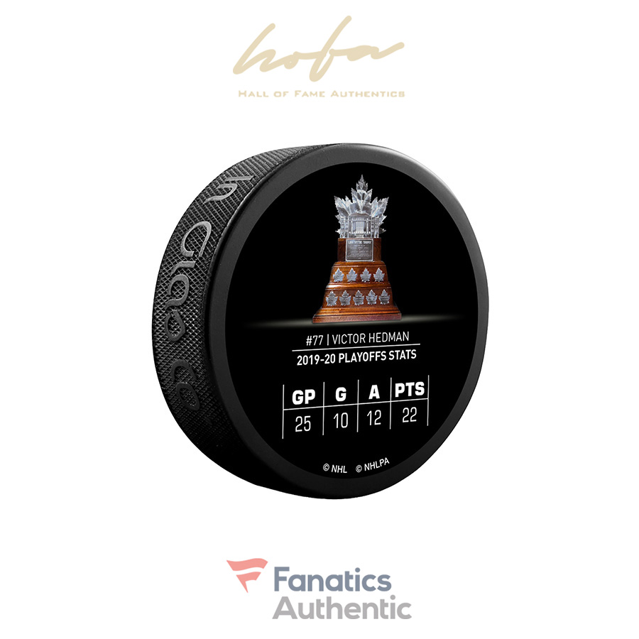 This puck has been personally hand-signed by Victor Hedman. It is officially licensed by the National Hockey League and comes with an individually numbered, tamper-evident hologram from Fanatics Authentic. To ensure authenticity, the hologram can be reviewed online. This process helps to ensure that the product purchased is authentic and eliminates any possibility of duplication or fraud. This is a limited edition of 177.